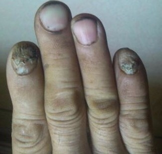 4、出现甲分离、甲脱落:由于增厚的病甲角质物堆积容易变干,逐渐易碎变成粉末状,导致甲板与甲床出现分离,甲板从甲床上脱落下来.此外在真菌的吞噬下病甲还会出现灰色、黄色以及深褐色等颜色.